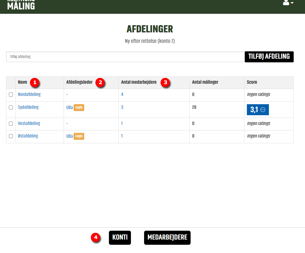 Hvis vi skal hjælpe en Medarbejder kan vi logge ind som den Medarbejder på deres konto ved at klikke på Login. - I bunden kan vi vælge at se listen over Afdelinger eller vende tilbage til Konti oversigten