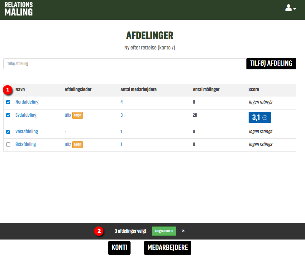 - Ved at markere 2 eller flere Afdelinger kan disse lægges sammen
