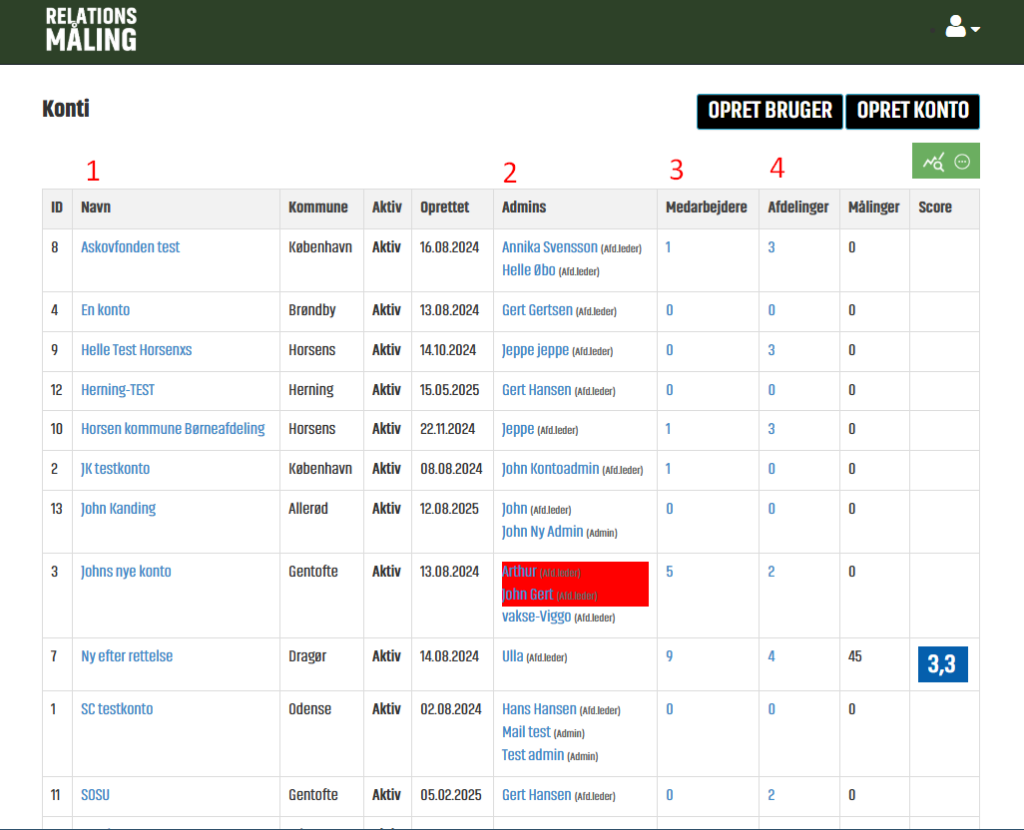- Klik på en Admin for at redigere denne. Inkl. deaktivering. Deaktiverede eller ophørte Medarbejdere vises med en farve