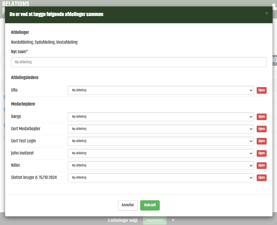Derefter kan der ændres på nuværende Afdelingsleder, samt Medarbejdere. Vi kan fjerne Medarbejdere og flytte rundt på dem